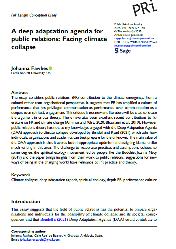 Delighted to see my essay, applying Jim Bendell’s Deep Adaptation Agenda to the field of public relations, published in Public Relations Inquiry. It develops and deepens themes from my book, Depth Public Relations, After the Masquerade (Routledge, 2023), with a particular focus on PR’s contribution to the climate emergency and its potential part in helping organisations and individuals navigate pathways through turbulent times.